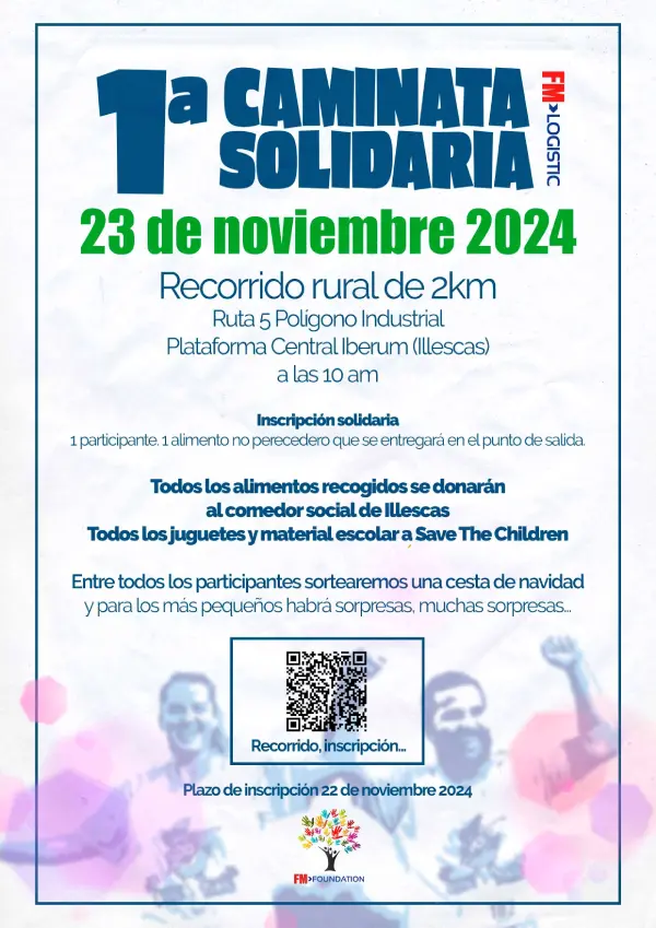 Este próximo sábado, 23 de noviembre, os invitamos a participar en la 1ª Caminata Solidaria organizada porFM Logistic Ibéricaen Plataforma Central Iberum. 🏃♀️✨ 📍 Recorrido rural de 2 km, iniciando desde el Parque de los Olivos, en la Avenida de la Logística, enfrente de la nave deToyota Motor Corporation. 📅 Hora: 10:00 AM 📌 Lugar: Ruta 5, Plataforma Central Iberum, Illescas Inscripción: Solo necesitas traer al punto de salida un alimento no perecedero o material escolar. Todo lo recogido será donado a el Comedor Social de Illescas y aSave the Children España. 🎁 Además, habrá un sorteo de una cesta de Navidad y sorpresas para los más pequeños. Iniciativas que fomentan la solidaridad y el compromiso con nuestra comunidad. ¡Marquemos la diferencia juntos! Inscríbete ahora:https://lnkd.in/dENj45ay